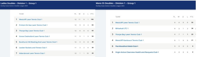 The Essex Seniors Doubles Leagues are over for 2025 and Westcliff Lawn had two teams claiming top spot in Division 1 of their leagues! Our Ladies 1st team finished with over 100 points after 12 matches whilst our Mens 55s 1st team were unbeaten. Very well done to all the players involved in the two winning teams! For the ladies Cally Flinders (captain), Gill Sanderson, Sue Sergeant, Sarah O’Sullivan, Sarah Jolley, Sarah Ball, Marg Rimmer, Chrissie Christou and Nicola Hopkins, and for the men Steve Wynn (captain), Greg Huggett, David Lambe, Tim Willcock, Gary Reynolds, Simon Milner and Rowland Swain. All our other teams in the Seniors leagues finished in either second or third place in their respective divisions so a great season for the club!